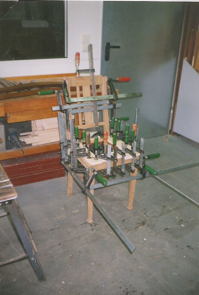 Die Stuhlteile werden geschliffen und nach erneuter Leimangabe unter Verwendung von Schraubzwingen verleimt.